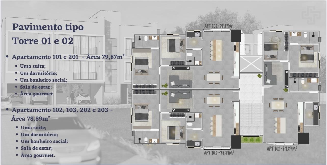 Apartamentos a partir de 78,89 m², com 2 dormitórios (sendo 1 suíte), projetados com espaços amplos, modernos e funcionais.